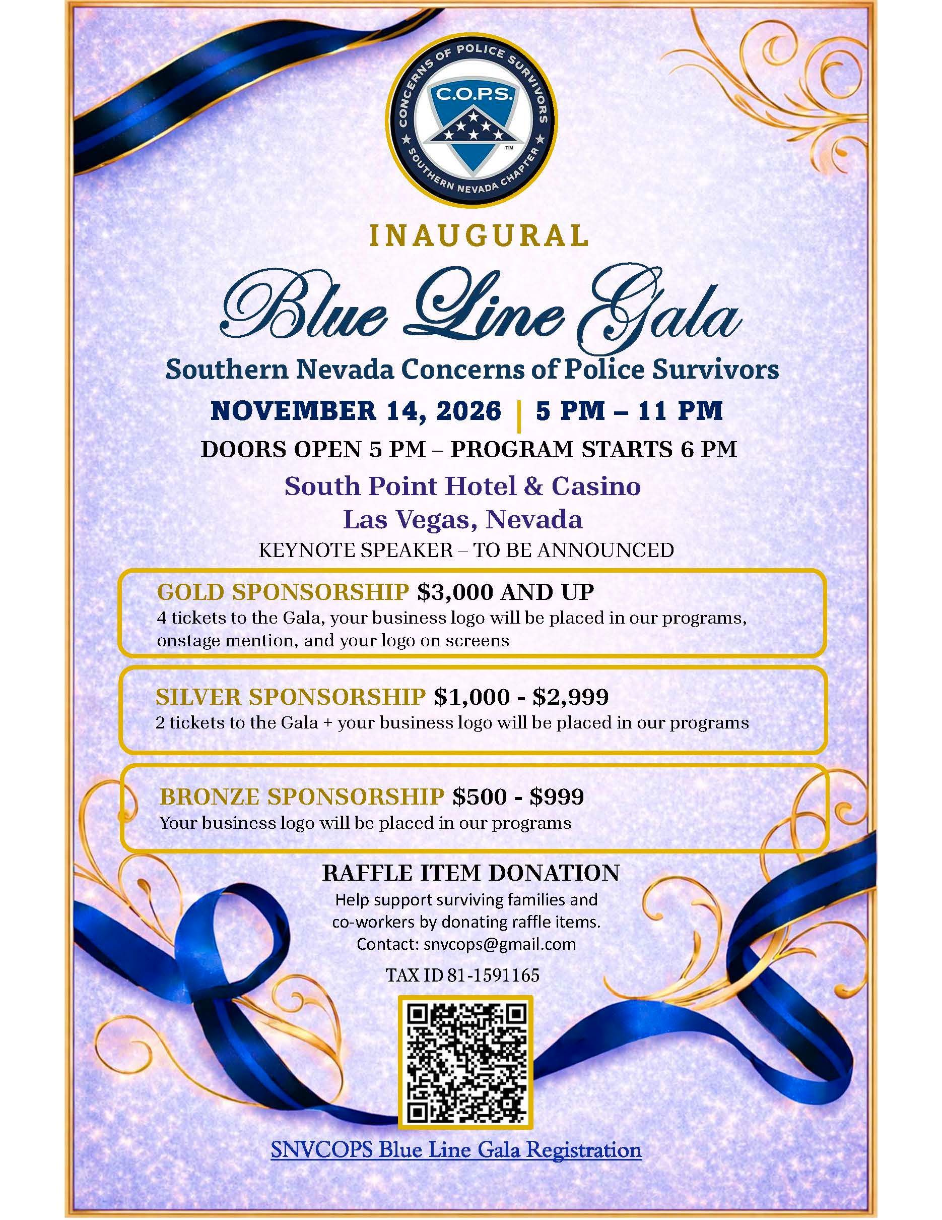 Please join us in supporting Southern Nevada Concerns of Police Survivors (C.O.P.S.). All funds raised will stay in Southern Nevada to support our mission of rebuilding the shattered lives of surviving families and affected coworkers of law enforcement officers killed in the line of duty.